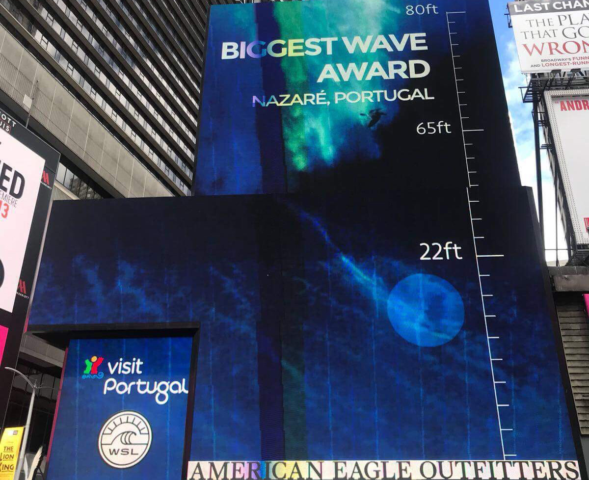 The advert, with the logo Visit Portugal, will run non-stop for 15 days in the US city on a 24,38 metre-high LED screen on a structure with the same dimensions as the wave surfed by the record breakers. (24.38 metres)