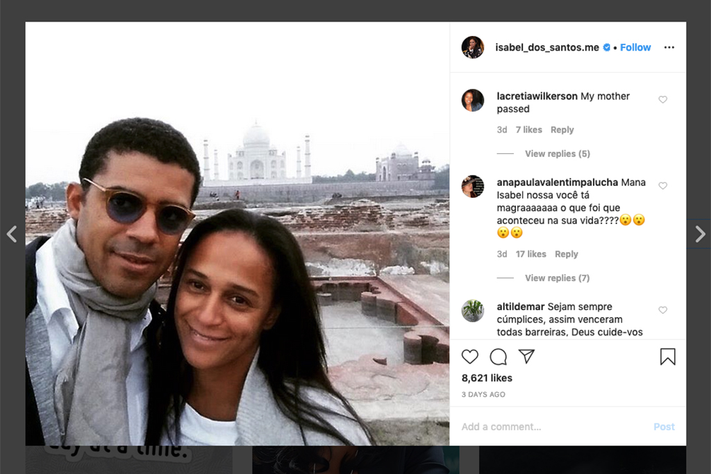 Portugal is said to be investigating house purchases by Isabel dos Santos – daughter of the former long-term Angolan president Eduardo dos Santos – as the 46-year-old wanted for questioning in Angola over the Luanda Leaks dossier has posted a happy snap of herself and her husband posing on Valentine’s Day outside the Tan Mahal in India.