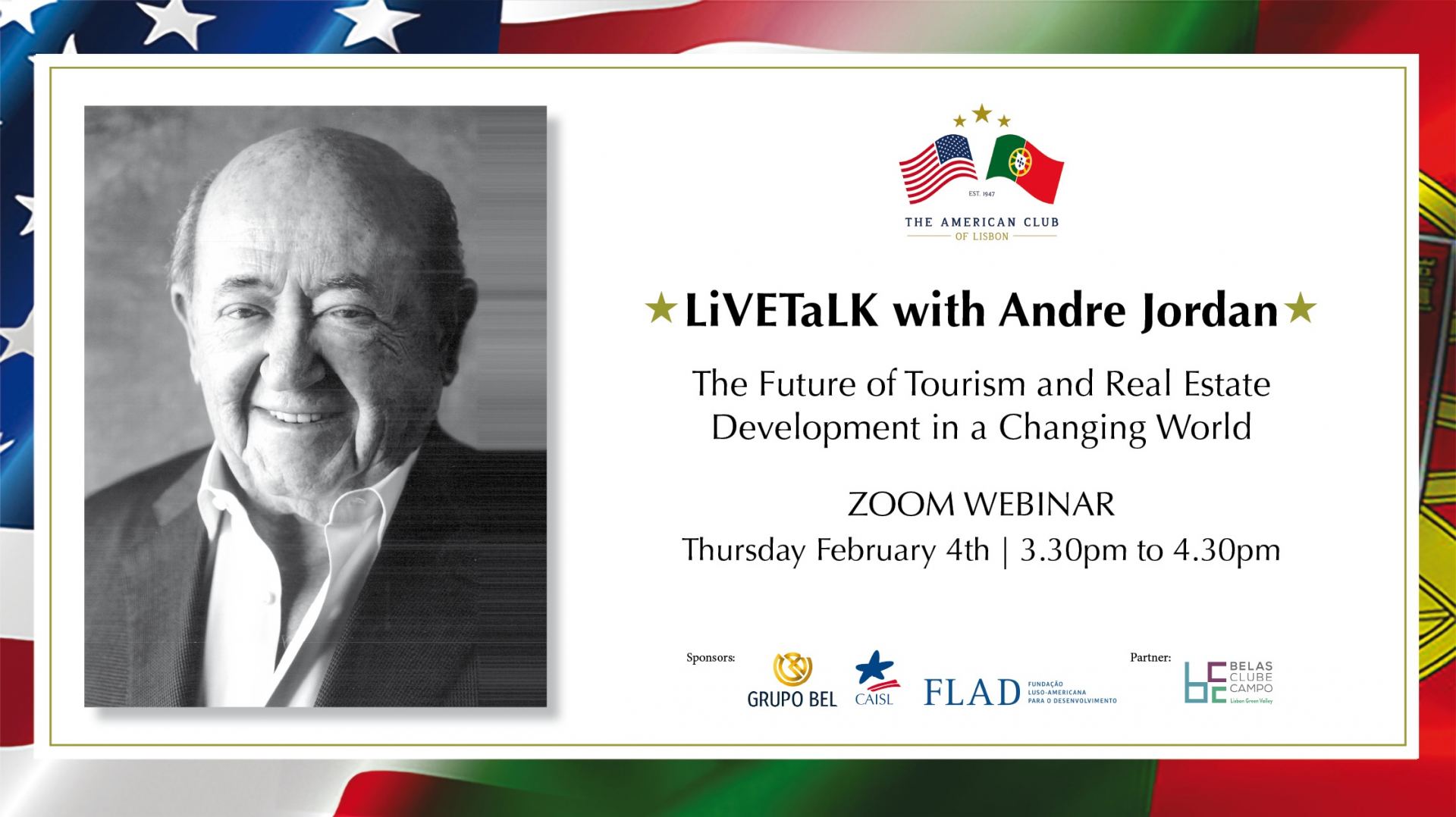 The American Club of Lisbon (ACL) will present a LiveTalk featuring keynote speaker tourism developer André Jordan on Thursday, February 4, at 3:30 pm on ZOOM.