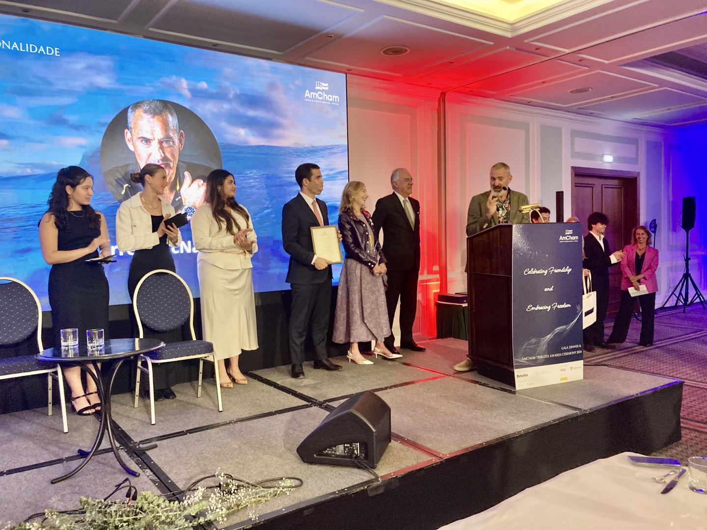 Picking up his AmCham Personality Award, he said he was “grateful and humbled to even be considered” and explained how in 2007 he got an e-mail from a local town hall bodyboarder in Nazaré and asked if he could explore Nazaré’s waves and promote the town as a surfing destination. It was his wife Nicole who persuaded him to go.