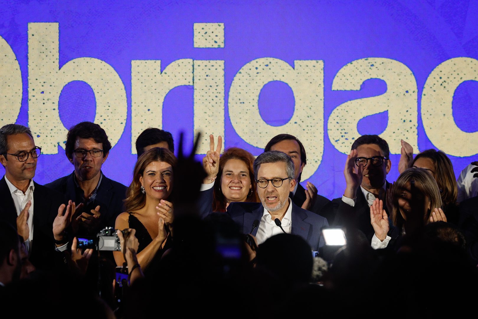 epa12449635 Carlos Moedas (C), candidate of the coalition PSD/IL/CDS for Lisbon City Council, delivers his victory speech during election night for the local elections in Lisbon, Portugal, 13 October 2025. More than 9.3 million voters were eligible to vote nationwide on 12 October 2025. EPA/ANTONO PEDRO SANTOS